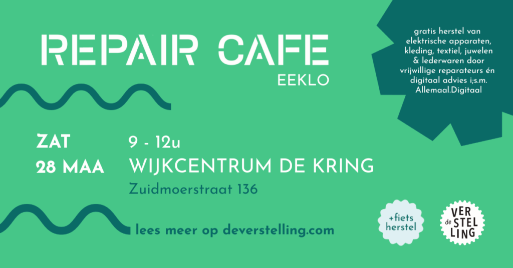 Ook in Eeklo is er een Repair Café. Er zijn zes ‘gewone’ Repair Cafés per jaar. Driemaal in LDC Zonneheem en driemaal in Wijkcentrum De Kring, telkens op zaterdagvoormiddag van 9.00 tot 12.00 uur. Daarnaast zijn er twee ‘XL Repair Cafes’ bij M-accent in de Eeklose Kringloopwinkel waar er op zaterdag doorlopend wordt hersteld van 10.00 tot 16.00 uur.